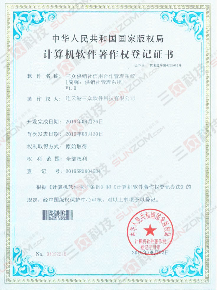 近日,我公司自主研发的“三众供销社信用合作管理系统V1.0”软件,获得国家版权局计算机软件著作权登记证书,自颁证之日起,该系统软件的版权将得到中国版权保护中心的有效保护。