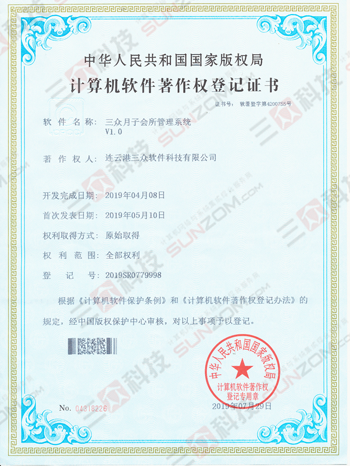 近日,我公司自主研发的一款软件产品“三众月子会所管理系统V1.0”,获得国家版权局计算机软件著作权登记证书。登记号:2019SR0779998