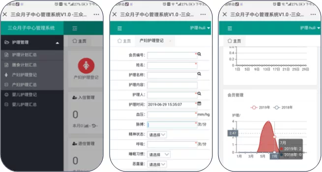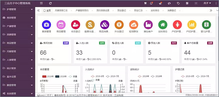 三众月子中心管理软件主要有护理管理、查房管理、产康管理、消费管理、商品管理、月嫂管理、人事管理、统计报表、基本设置、膳食管理、系统管理等功能。