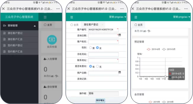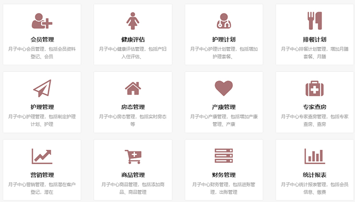 系统可实现客户、护理、服务、房态、人事、门店、商品、财务、营销等各个环节全都管理起来。满足月子中心连锁化经营需求、提升运营效率。能更好的降低管理成本、提高入住率、增加营业额、获得客户好评、形成核心竞争力!