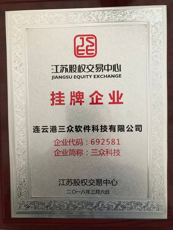 2018年3月23日,连云港三众软件科技有限公司,简称“三众科技”(挂牌代码:692581),在江苏股权交易中心成功挂牌。