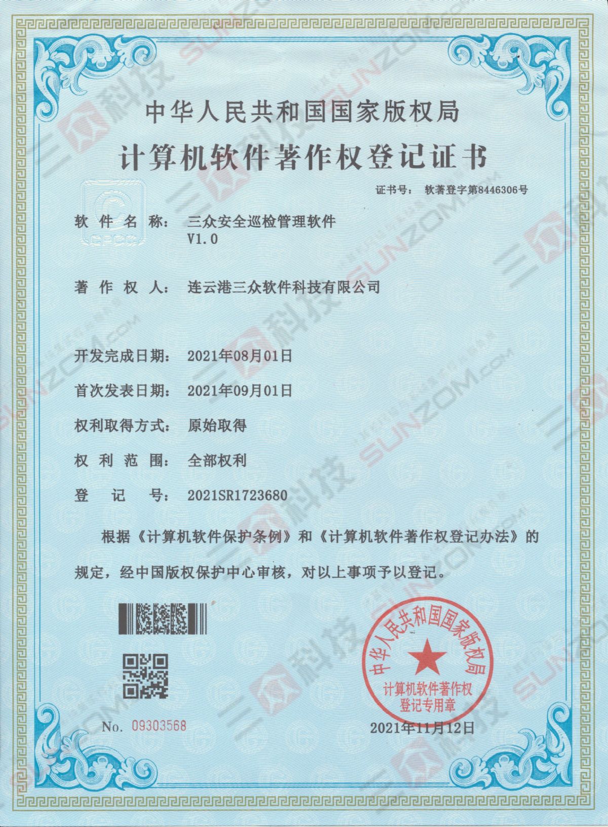 近日,我公司自主研发的一款软件产品“三众安全巡检管理软件V1.0”,获得国家版权局计算机软件著作权登记证书。登记号:2021SR1723680。